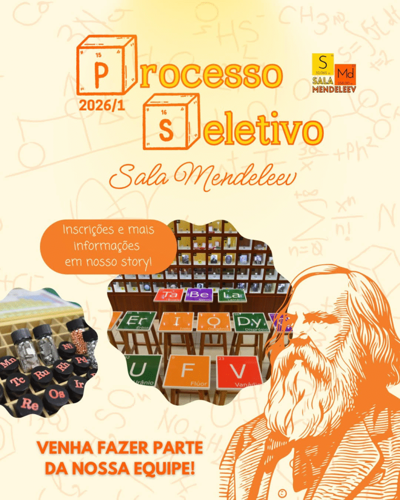 O projeto Sala Mendeleev está selecionando novos integrantes. Conforme o edital, podem se candidatar estudantes dos cursos de Química (licenciatura ou bacharelado), Bioquímica e Engenharia Química da UFV. As inscrições vão até sexta-feira (7). Para concorrer, é necessário enviar o histórico escolar e o horário de aulas referentes a 2025/2, por meio do formulário disponível em forms.gle/Jf1wpLMGQkzHXgnV8.